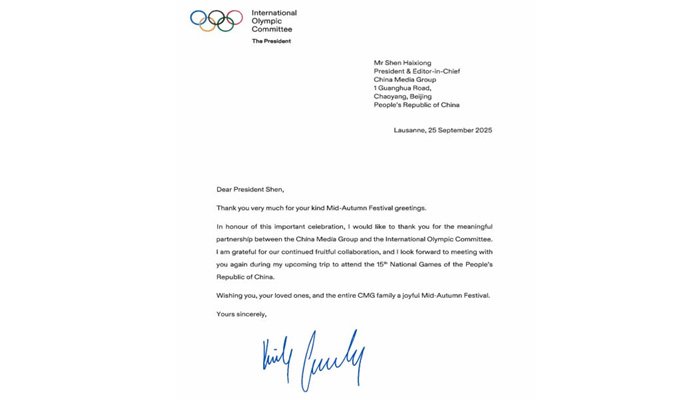 سی ایم جی کے صدر شین ہائی شیونگ کے نام ارسال کردہ خط میں، صدر کووینٹری نے کہا کہ ” اس خوشی کے موقع پر، میں آپ کا شکریہ ادا کرنا چاہتی ہوں! چائنا میڈیا گروپ اور بین الاقوامی اولمپک کمیٹی کے درمیان معنی خیز دوستانہ شراکت داری قابل فخر ہے، اور دونوں فریقوں کے درمیان مسلسل اور ثمر آور تعاون قابل اطمینان ہے۔