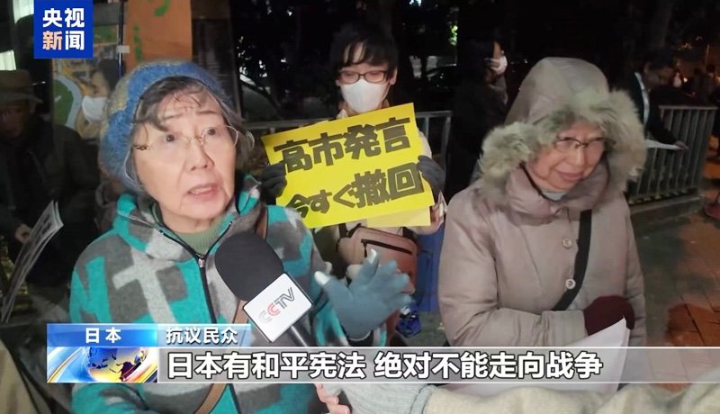 چین کے خلاف سانائے تاکائیچی کے اشتعال انگیز ریمارکس ناقابل قبول ہیں۔ جاپان کے پاس امن پسند آئین موجود ہے، اس لیے ملک کو ہرگز جنگ کی راہ پر نہیں چلنا چاہیے۔ مظاہرین نے مطالبہ کیا کہ سانائے تاکائیچی اپنے بیانات واپس لیں اور معافی مانگ کر استعفیٰ دیں۔اسی روز روسی وزارتِ خارجہ کی ترجمان، ماریہ زاخارووا نے کہا کہ جاپانی حکومت کے جنگ پسند بیانات اور اقدامات نے نہ صرف علاقائی کشیدگی میں اضافہ کیا ہے بلکہ جاپانی آئین کی خلاف ورزی بھی کی ہے۔